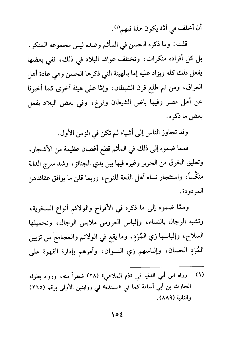 قلت: وما ذكره الحسن في المأثم وضده ليس مجموعه المنكر، بل كل أفراده منكرات، وتختلف عوائد البلاد في ذلك، ففي بعضها يفعل ذلك كله ويزاد عليه إما بالهيئة التي ذكرها الحسن وهي عادة أهل العراق، ومن ثم طلع قرن الشيطان، وإمَّا على هيئة أخرى كما أخبرنا عن أهل مصر وفيها باض الشيطان وفرخ، وفي بعض البلاد يفعل بعض ما ذكره.