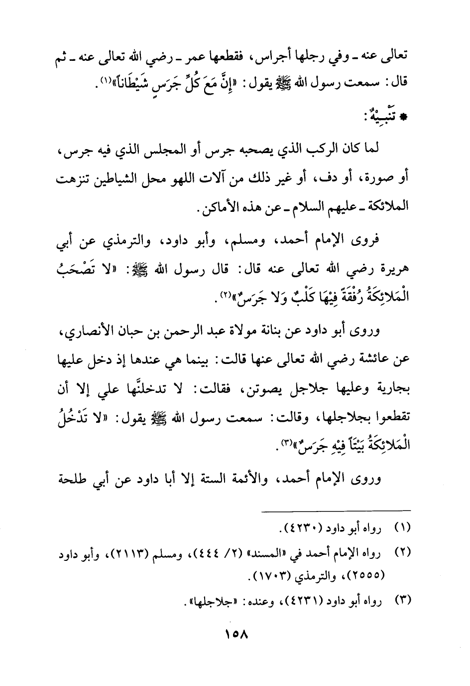 وروى أبو داود عن بنانة مولاة عبد الرحمن بن حبان الأنصاري، عن عائشة رضي الله تعالى عنها قالت: بينما هي عندها إذ دخل عليها بجارية وعليها جلاجل يصوتن، فقالت: لا تدخلنَّها علي إلا أن تقطعوا بجلاجلها، وقالت: سمعت رسول الله - صلى الله عليه وسلم - يقول: "لا تَدْخُلُ الْمَلائِكَةُ بَيْتًا فِيْهِ جَرَسٌ" (¬3).