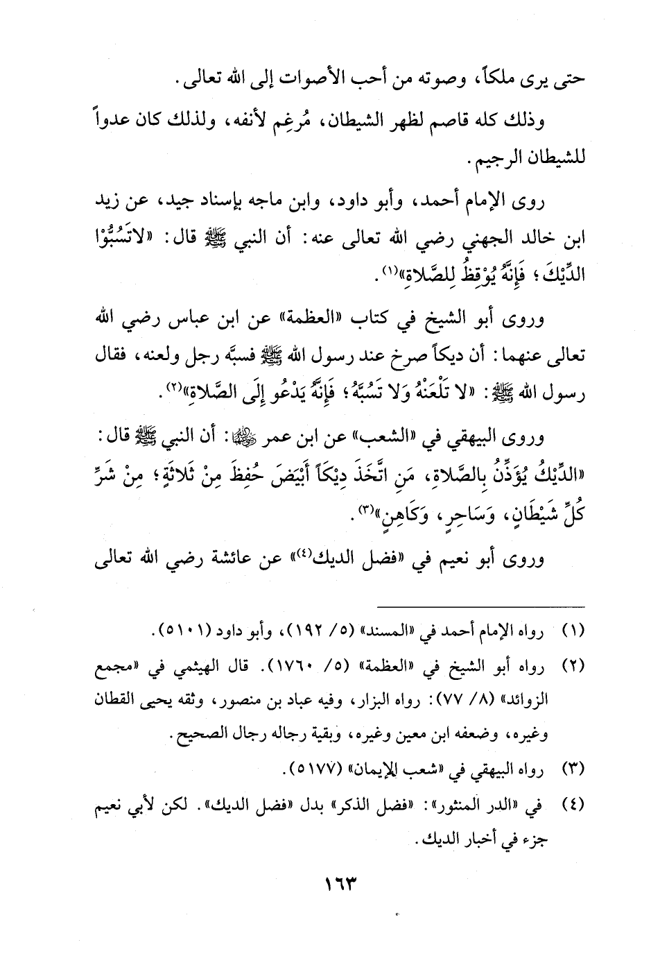 وروى أبو الشيخ في كتاب "العظمة" عن ابن عباس رضي الله تعالى عنهما: أن ديكاً صرّح عند رسول الله - صلى الله عليه وسلم - فسبَّه رجل ولعنه، فقال رسول الله - صلى الله عليه وسلم -: "لا تَلْعَنْهُ وَلا تَسُبَّهُ؛ فَإِنَّهُ يَدْعُو إِلَى الصَّلاةِ" (¬2).