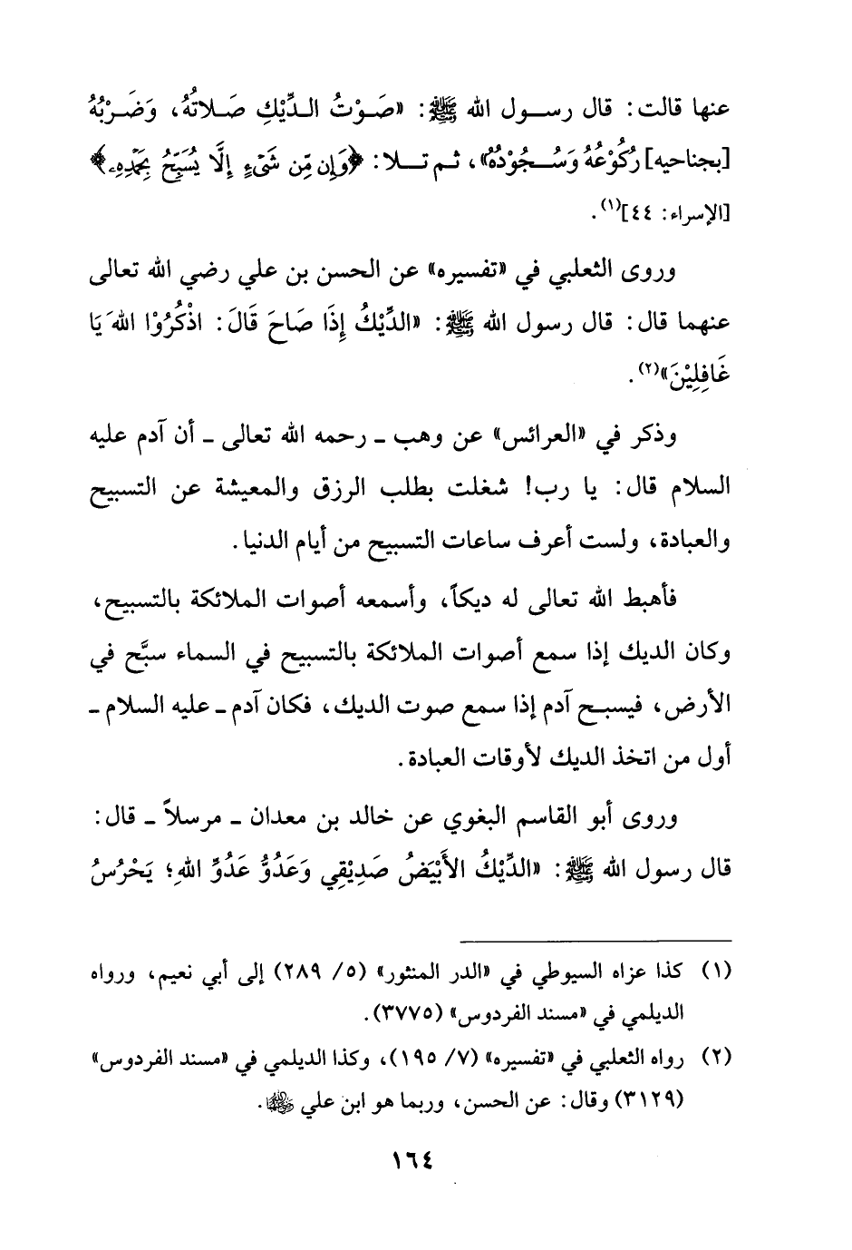 وروى الثعلبي في "تفسيره" عن الحسن بن علي رضي الله تعالى عنهما قال: قال رسول الله - صلى الله عليه وسلم -: "الدِّيْكُ إِذَا صَاحَ قَالَ: اذْكُرُوْا اللهَ يَا غَافِلِيْنَ" (¬2).
