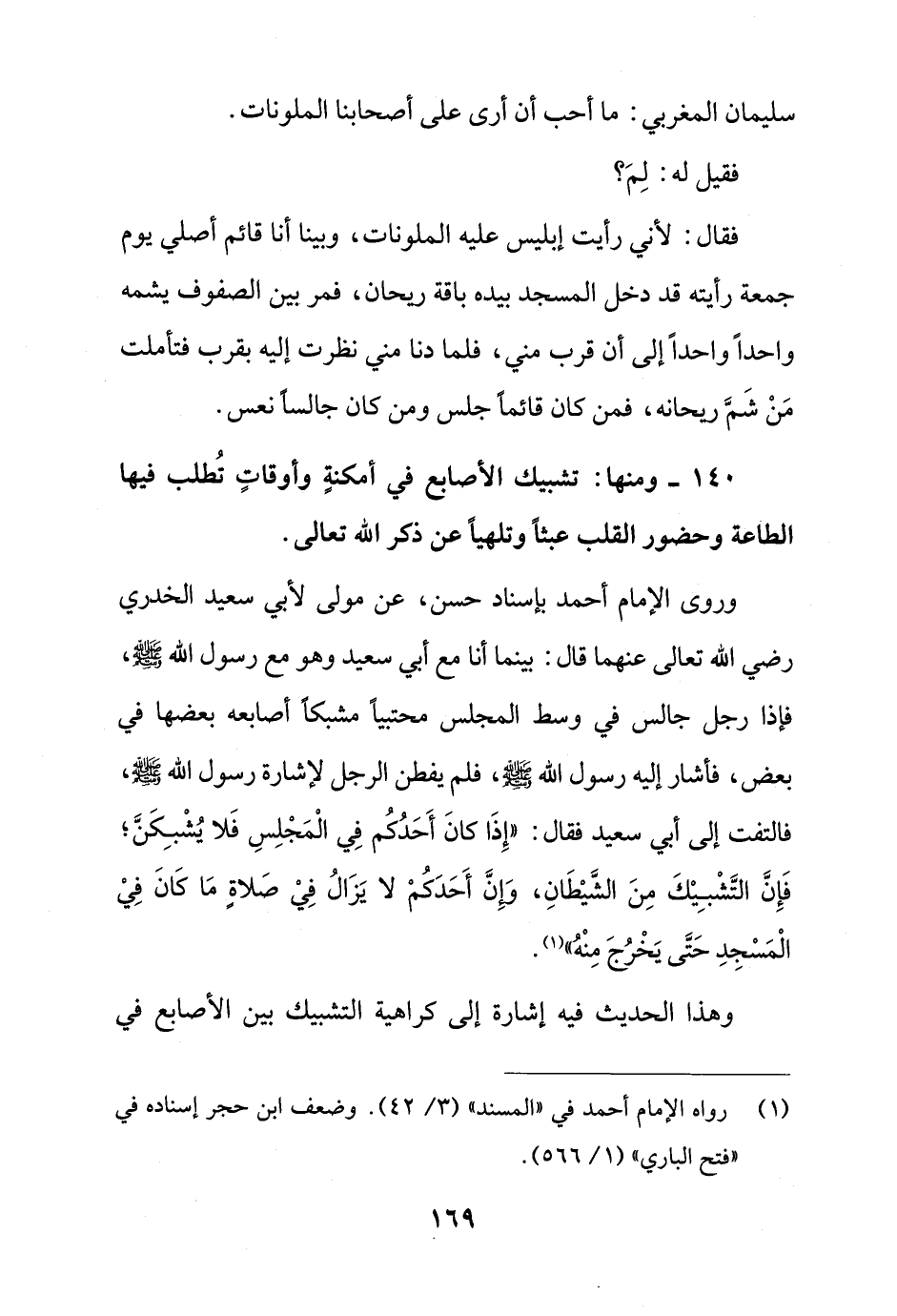140 - ومنها: تشبيك الأصابع في أمكنةٍ وأوقاتٍ تُطلب فيها الطاعة وحضور القلب عبثاً وتلهياً عن ذكر الله تعالى.