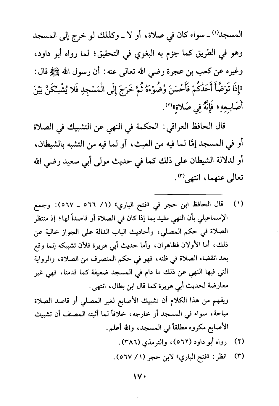 (¬1) قال الحافظ ابن حجر في "فتح الباري" (1/ 566 - 567): وجمع الإسماعيلي بأن النهي مقيد بما إذا كان في الصلاة أو قاصداً لها؛ إذ منتظر الصلاة في حكم المصلي، وأحاديث الباب الدالة على الجواز خالية عن ذلك، أما الأولان فظاهران، وأما حديث أبي هريرة فلأن تشبيكه إنما وقع بعد انقضاء الصلاة في ظنه، فهو في حكم المنصرف من الصلاة، والرواية التي فيها النهي عن ذلك ما دام في المسجد ضعيفة كما قدمنا، فهي غير معارضة لحديث أبي هريرة كما قال ابن بطال، انتهى.