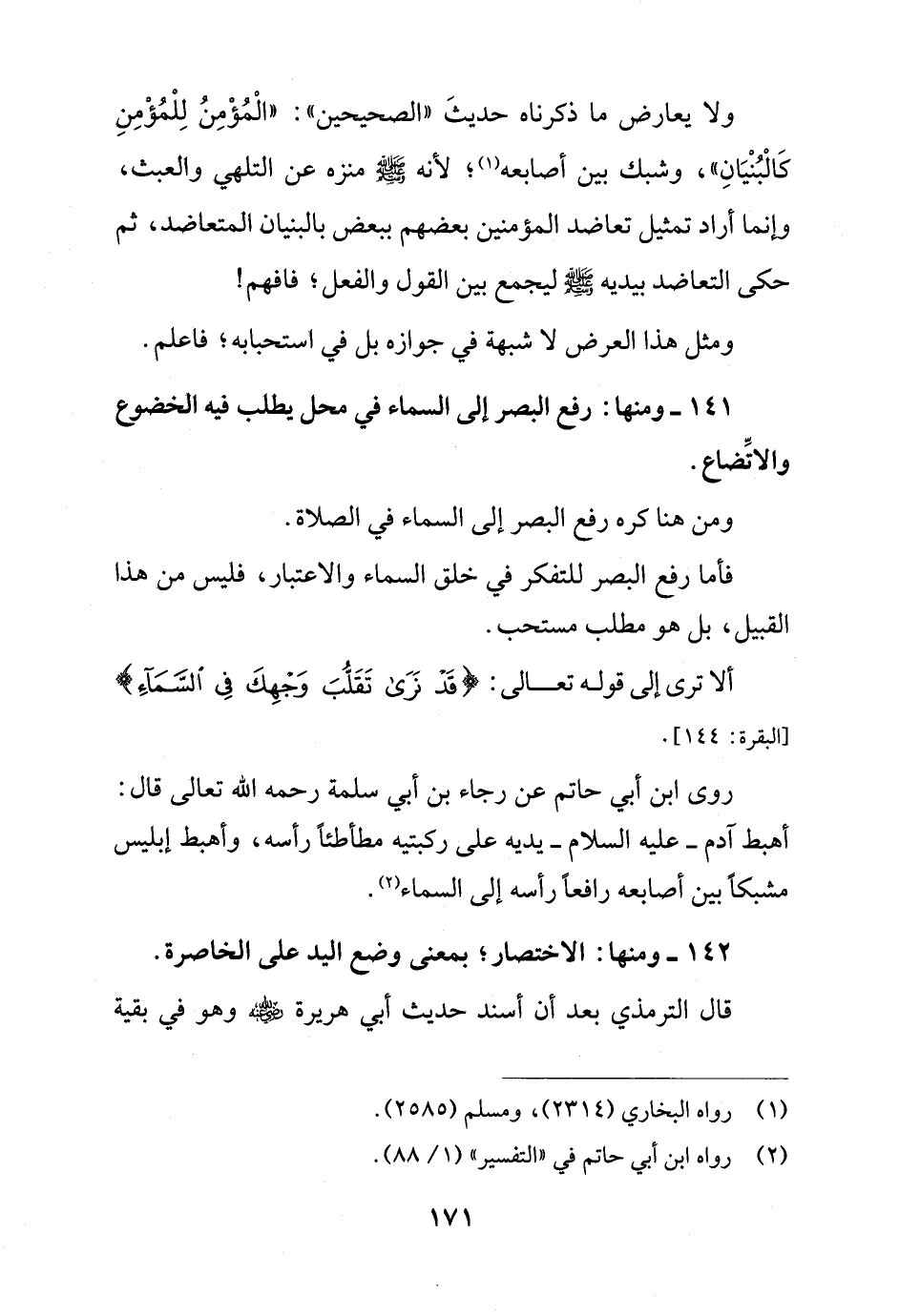 141 - ومنها: رفع البصر إلى السماء في محل يطلب قيه الخضوع والاتِّضاع.