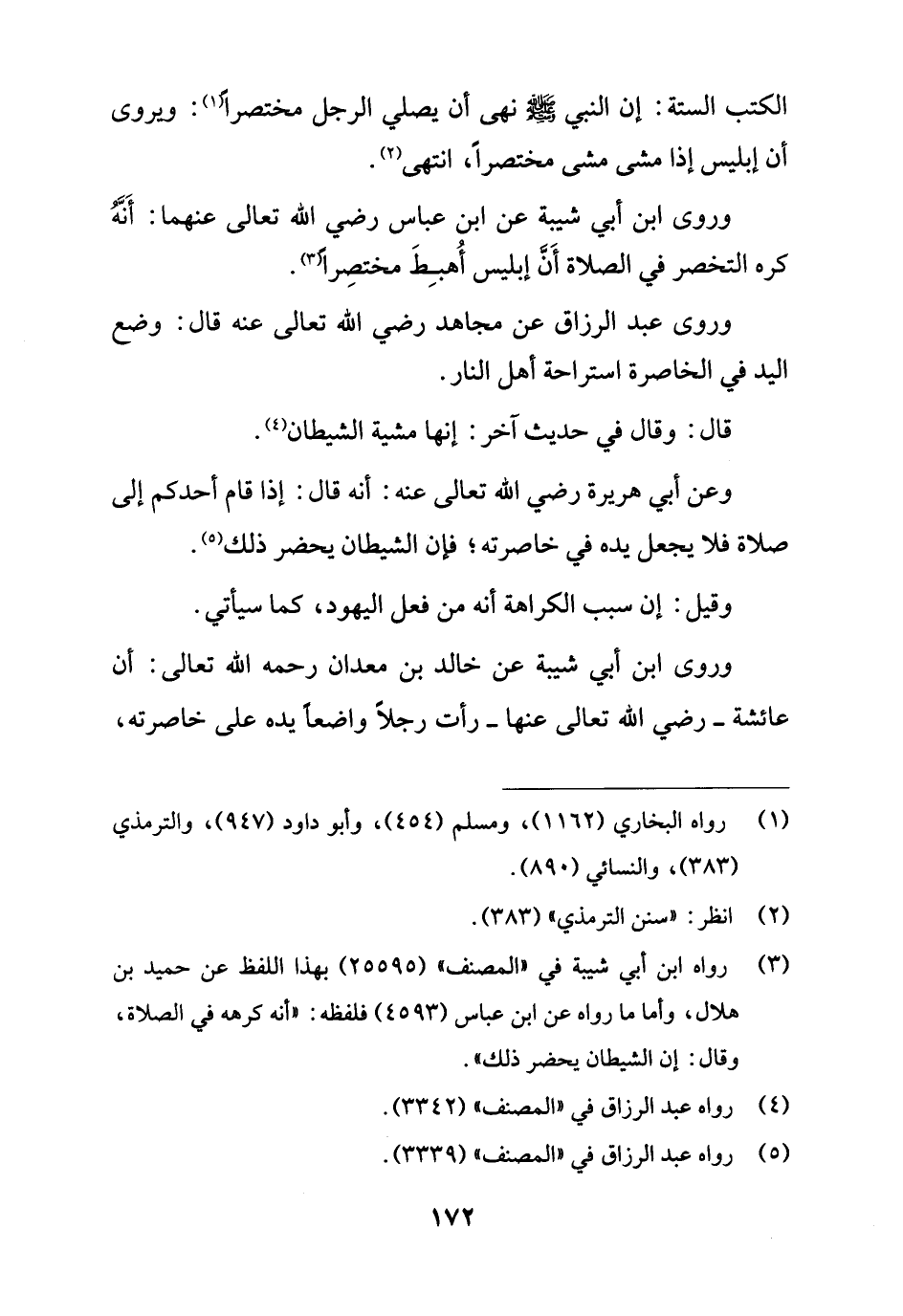 الكتب الستة: إن النبي - صلى الله عليه وسلم - نهى أن يصلي الرجل مختصراً (¬1): ويروى أن إبليس إذا مشى مشى مختصراً، انتهى (¬2).