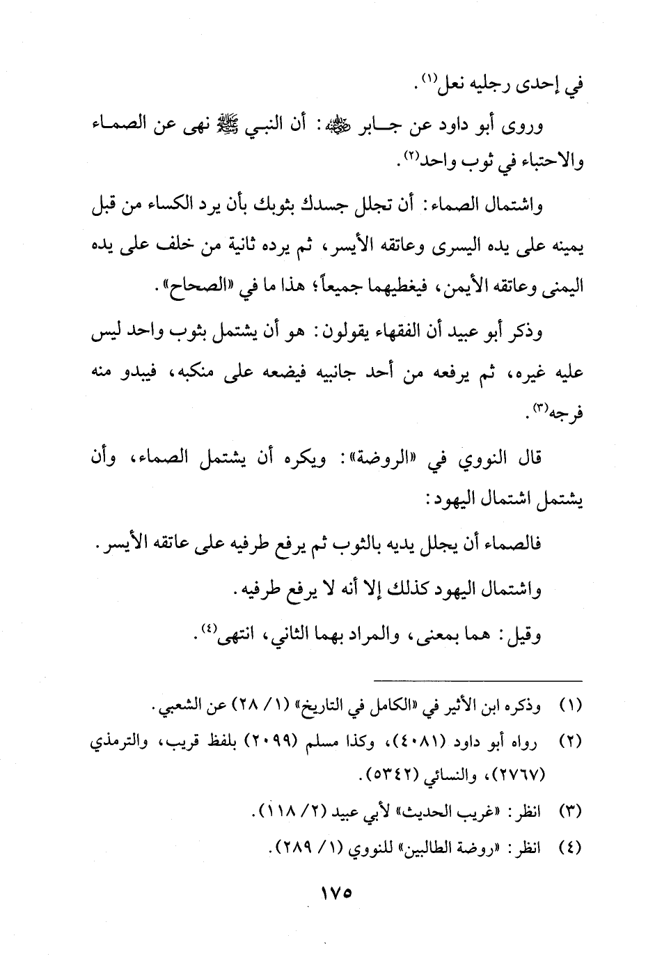 وروى أبو داود عن جابر - رضي الله عنه -: أن النبي - صلى الله عليه وسلم - نهى عن الصماء والاحتباء في ثوب واحد (¬2).