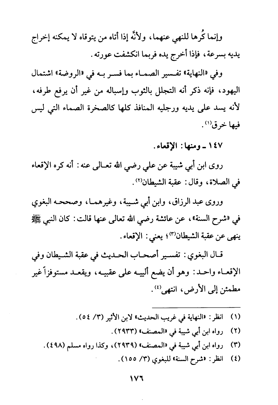 وروى عبد الرزاق، وابن أبي شيبة، وغيرهما، وصححه البغوي في "شرح السنة"، عن عائشة رضي الله تعالى عنها قالت: كان النبي - صلى الله عليه وسلم - ينهى عن عقبة الشيطان (¬3)؛ يعني: الإقعاء.