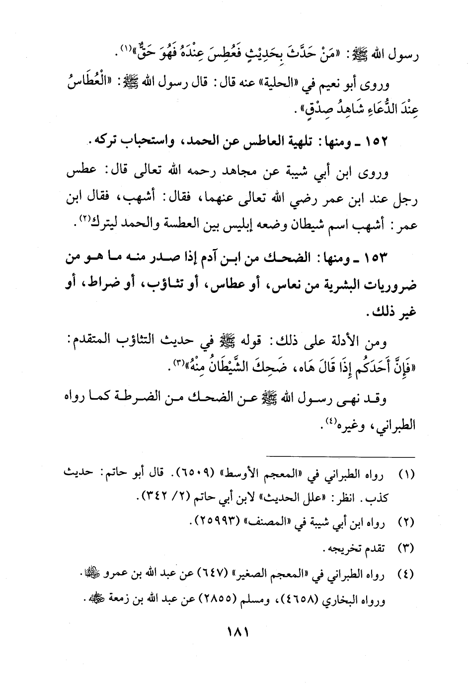 153 - ومنها: الضحك من ابن آدم إذا صدر منه ما هو من ضروريات البشرية من نعاس، أو عطاس، أو تثاؤب، أو ضراط، أو غير ذلك.