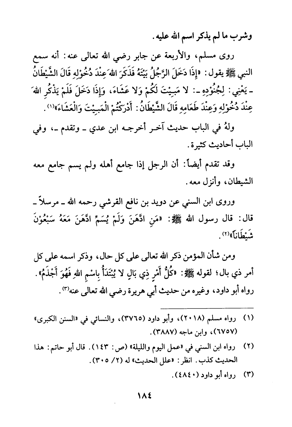 روى مسلم، والأربعة عن جابر رضي الله تعالى عنه: أنه سمع النبي - صلى الله عليه وسلم - يقول: "إِذَا دَخَلَ الرَّجُلُ بَيْتَهُ فَذَكَرَ اللهَ عِنْدَ دُخُوْلهِ قَالَ الشَّيْطَانُ - يَعْنِي: لِجُنُوْدهِ -: لا مَبِيْتَ لَكُمْ وَلا عَشَاءَ، وإذَا دَخَلَ فَلَمْ يَذْكُرِ اللهَ عِنْدَ دُخُوْلهِ وَعِنْدَ طَعَامِهِ قَالَ الشَّيْطَانُ: أَدْرَكْتُمْ الْمَبِيْتَ وَالْعَشَاء" (¬1).