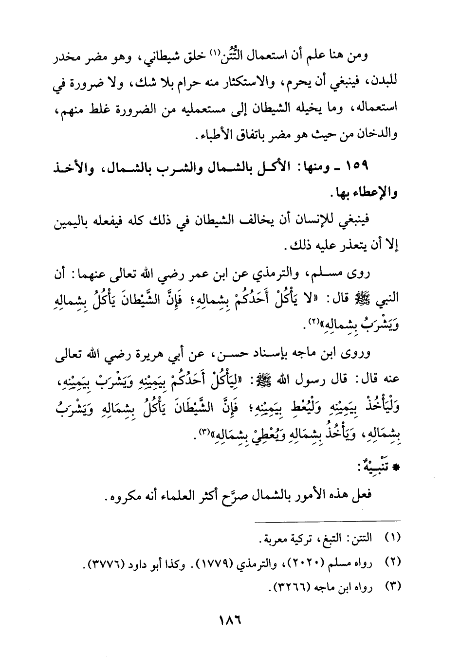 159 - ومنها: الأكل بالشمال والشرب بالشمال، والأخذ والأعطاء بها.