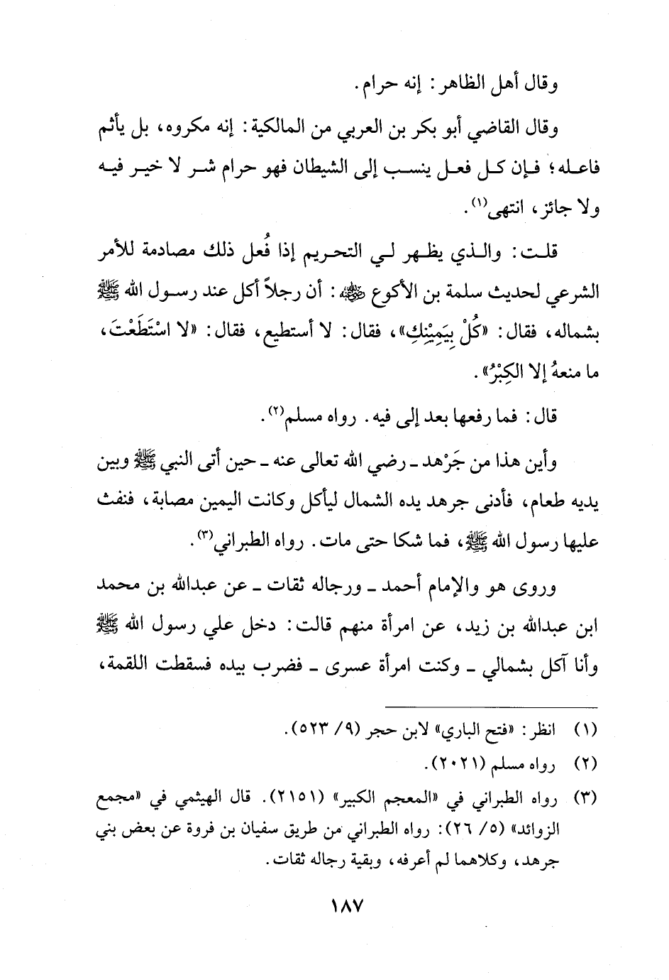 وروى هو والإمام أحمد - ورجاله ثقات - عن عبد الله بن محمد ابن عبد الله بن زيد، عن امرأة منهم قالت: دخل علي رسول الله - صلى الله عليه وسلم - وأنا آكل بشمالي - وكنت امرأة عسرى - فضرب بيده فسقطت اللقمة،
