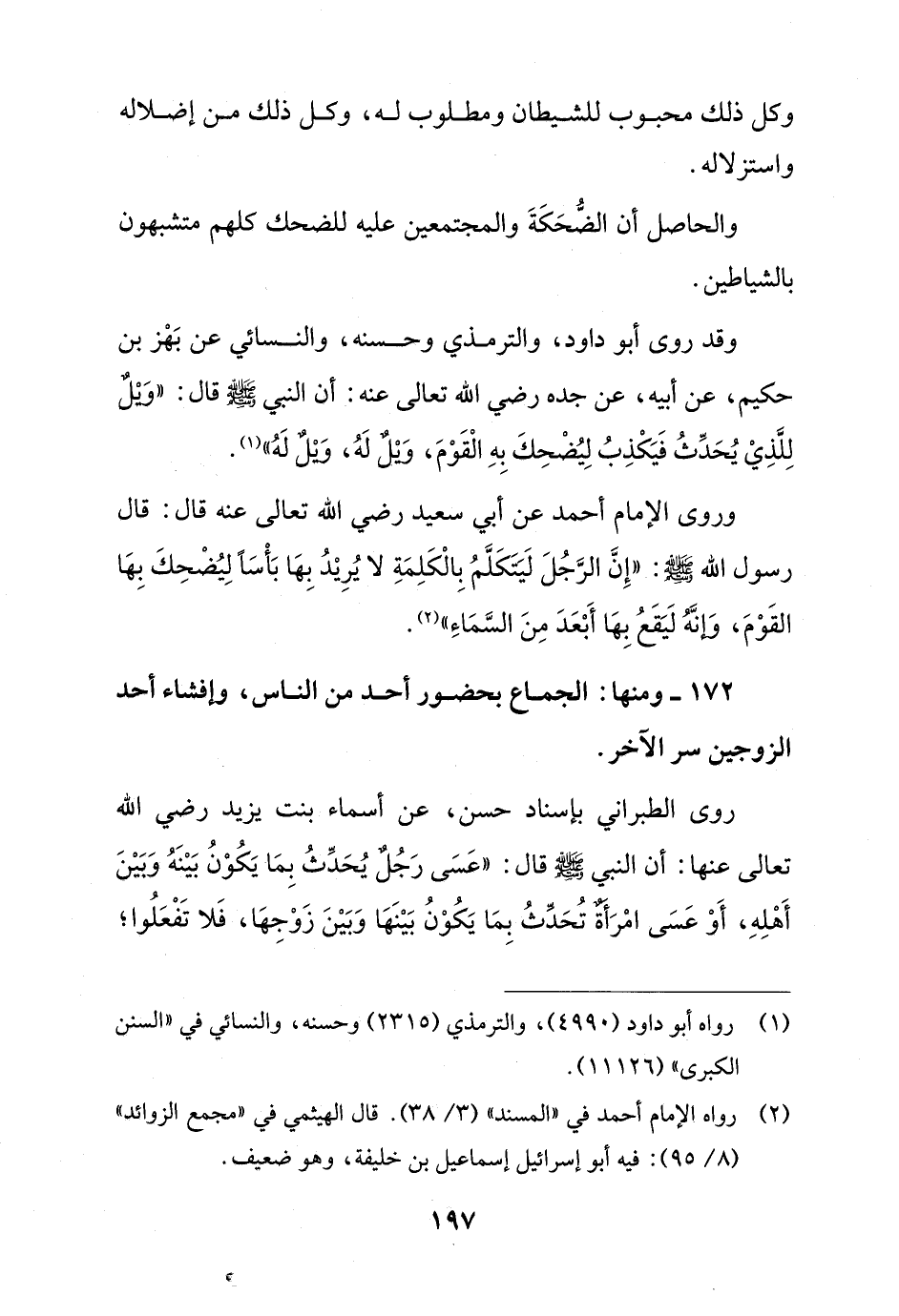 172 - ومنها: الجماع بحضور أحد من الناس، وإفشاء أحد الزوجين سر الآخر.