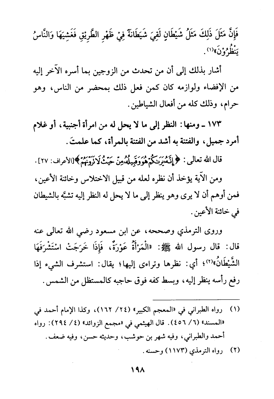 173 - ومنها: النظر إلى ما لا يحل له من امرأة أجنبية، أو غلام أمرد جميل، والفتنة به أشد من الفتنة بالمرأة، كما علمتَ.