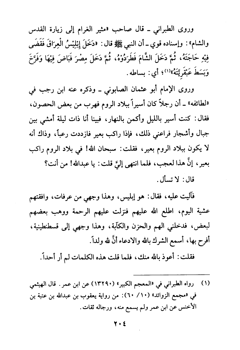فآليت عليه، فقال: هو إبليس، وهذا وجهي من عرفات، وافقتهم عشية اليوم، اطلع الله عليهم فنزلت عليهم الرحمة ووهب بعضهم لبعض، فدخلني الهم والحزن والكآبة، وهذا وجهي إلى قسطنطينية، أفرح بها، أسمع الشرك بالله والادعاء أنَّ لله ولداً.