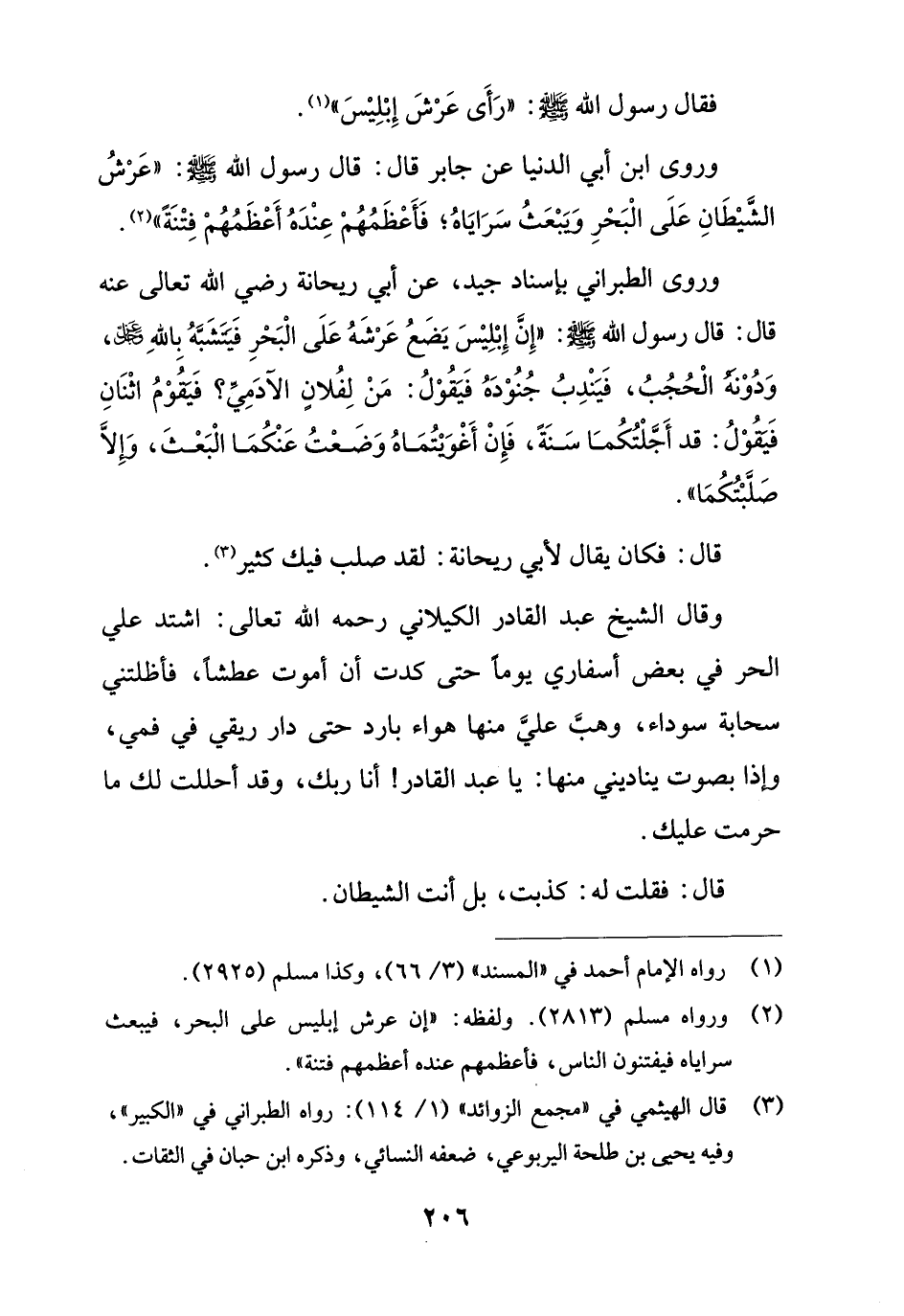 وروى الطبراني بإسناد جيد، عن أبي ريحانة رضي الله تعالى عنه قال: قال رسول الله - صلى الله عليه وسلم -: "إِنَّ إِبْلِيْسَ يَضَعُ عَرْشَهُ عَلَى الْبَحْرِ فَيتَشَبَّهُ بِاللهِ - عز وجل -، وَدُوْنه الْحُجُبُ، فَيَنْدِبُ جُنُوْدَهُ فَيَقُوْلُ: مَنْ لِفُلانٍ الآدَمِيِّ؟ فَيقُوْمُ اثْنَانِ فَيقُوْلُ: قد أَجَّلْتُكُمَا سَنَةً، فَإِنْ أَغْويتُمَاهُ وَضعْتُ عَنْكُمَا الْبَعْثَ، وإِلاَّ صَلَّبْتكُمَا".
