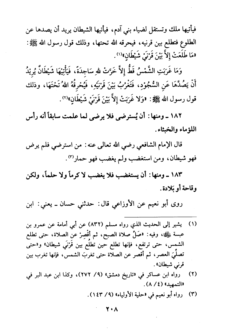 (¬1) يشير إلى الحديث الذي رواه مسلم (832) عن أبي أمامة عن عمرو بن عبسة - رضي الله عنهما -، وفيه: "صَلِّ صلاة الصبح، ثم أقْصِرْ عن الصلاة، حتى تطلع الشمس، حتى ترتفع، فإنها تطلع حين تطلُع بين قَرْنيَ شيطان" و"حتى تصلِّيَ العصر، ثم أقصر عن الصلاة حتى تغربَ الشمس، فإنها تغرب بين قرني شيطان".