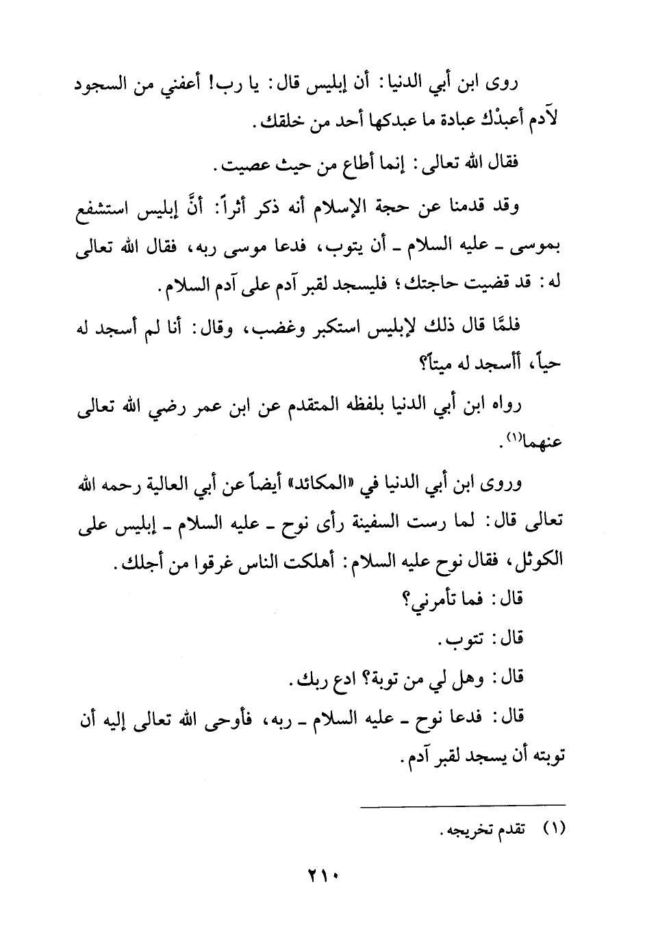 وقد قدمنا عن حجة الإسلام أنه ذكر أثراً: أنَّ إبليس استشفع بموسى - عليه السلام - أن يتوب، فدعا موسى ربه، فقال الله تعالى له: قد قضيت حاجتك؛ فليسجد لقبر آدم على آدم السلام.
