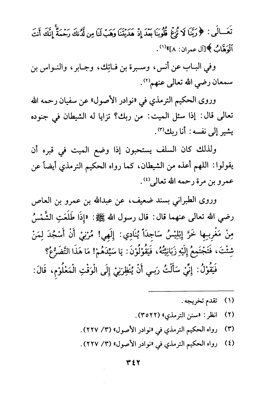 ولذلك كان السلف يستحبون إذا وضع الميت في قبره أن يقولوا: اللهم أعذه من الشيطان، كما رواه الحكيم الترمذي أيضًا عن عمرو بن مرة رحمه الله تعالى (¬4).