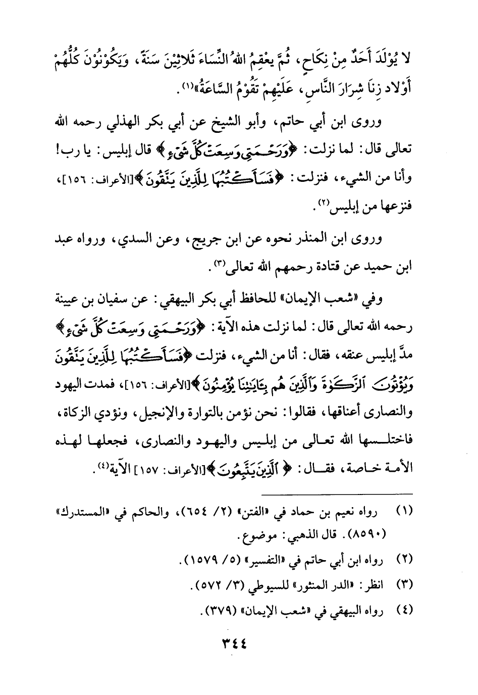 وفي "شعب الإيمان" للحافظ أبي بكر البيهقي: عن سفيان بن عيينة رحمه الله تعالى قال: لما نزلت هذه الآية: {وَرَحْمَتِي وَسِعَتْ كُلَّ شَيْءٍ (156)} [الأعراف: 156] مدَّ إبليس عنقه، فقال: أنا من الشيء، فنزلت {فَسَأَكْتُبُهَا لِلَّذِينَ يَتَّقُونَ وَيُؤْتُونَ الزَّكَاةَ وَالَّذِينَ هُمْ بِآيَاتِنَا يُؤْمِنُونَ (156)} [الأعراف: 156]، فمدت اليهود والنصارى أعناقها، فقالوا: نحن نؤمن بالتوارة والإنجيل، ونؤدي الزكاة، فاختلسها الله تعالى من إبليس واليهود والنصارى، فجعلها لهذه الأمة خاصة، فقال: {الَّذِينَ يَتَّبِعُونَ} [الأعراف: 157] الآية (¬4).