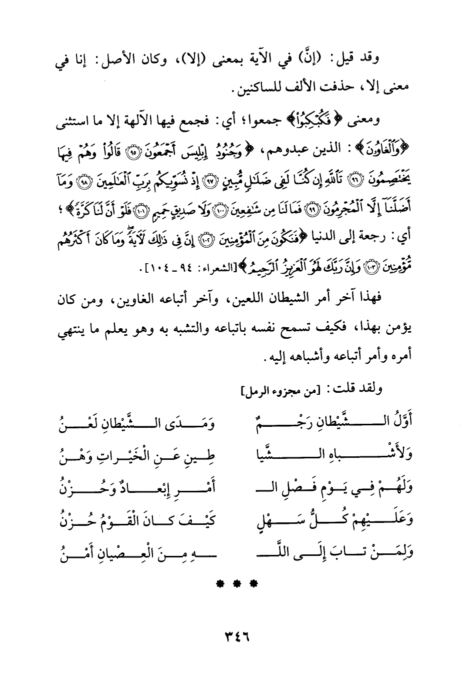 ومعنى {فَكُبْكِبُوا (94)} [الشعراء: 94] جمعوا؛ أي: فجمع فيها الآلهة إلا ما استثنى {وَالْغَاوُونَ (94)} [الشعراء: 94]: الذين عبدوهم، {وَجُنُودُ إِبْلِيسَ أَجْمَعُونَ (95) قَالُوا وَهُمْ فِيهَا يَخْتَصِمُونَ (96) تَاللَّهِ إِنْ كُنَّا لَفِي ضَلَالٍ مُبِينٍ (97) إِذْ نُسَوِّيكُمْ بِرَبِّ الْعَالَمِينَ (98) وَمَا أَضَلَّنَا إِلَّا الْمُجْرِمُونَ (99) فَمَا لَنَا مِنْ شَافِعِينَ (100) وَلَا صَدِيقٍ حَمِيمٍ (101) فَلَوْ أَنَّ لَنَا كَرَّةً} أي: رجعة إلى الدنيا {فَنَكُونَ مِنَ الْمُؤْمِنِينَ (102) إِنَّ فِي ذَلِكَ لَآيَةً وَمَا كَانَ أَكْثَرُهُمْ مُؤْمِنِينَ (103) وَإِنَّ رَبَّكَ لَهُوَ الْعَزِيزُ الرَّحِيمُ (104)} [الشعراء: 94 - 104].