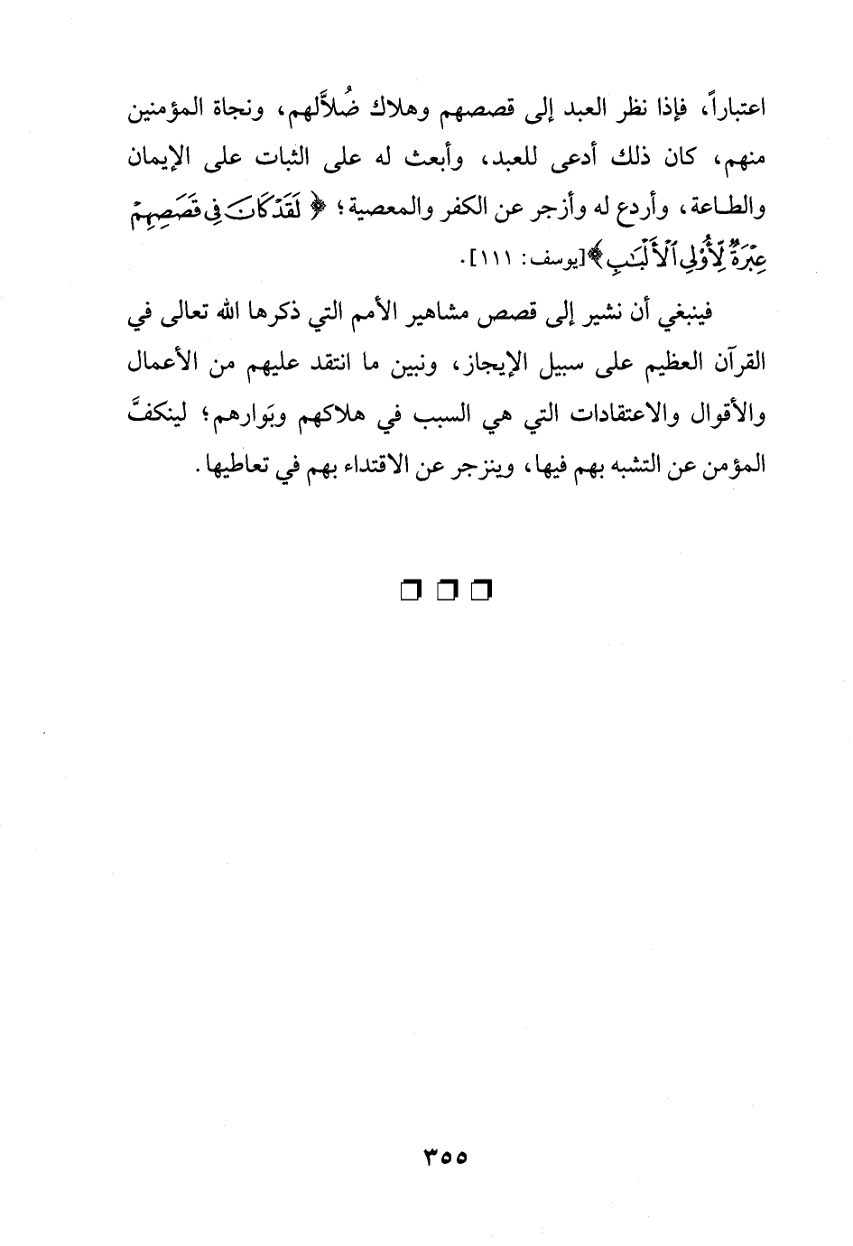 اعتبارًا، فإذا نظر العبد إلى قصصهم وهلاك ضُلاَّلهم، ونجاة المؤمنين منهم، كان ذلك أدعى للعبد، وأبعث له على الثبات على الإيمان والطاعة، وأردع له وأزجر عن الكفر والمعصية؛ {لَقَدْ كَانَ فِي قَصَصِهِمْ عِبْرَةٌ لِأُولِي الْأَلْبَابِ (111)} [يوسف: 111].