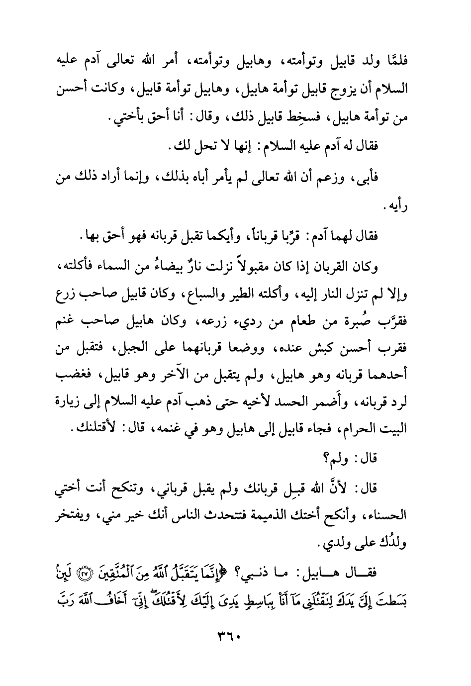 وكان القربان إذا كان مقبولاً نزلت نارٌ بيضاءُ من السماء فأكلته، وإلا لم تنزل النار إليه، وأكلته الطير والسباع، وكان قابيل صاحب زرع فقرَّب صُبرة من طعام من رديء زرعه، وكان هابيل صاحب غنم فقرَّب أحسن كبش عنده، ووضعا قربانهما على الجبل، فتقبل من أحدهما قربانه وهو هابيل، ولم يتقبل من الآخر وهو قابيل، فغضب لرد قربانه، وأَضمر الحسد لأخيه حتى ذهب آدم عليه السلام إلى زيارة البيت الحرام، فجاء قابيل إلى هابيل وهو في غنمه، قال: لأقتلنك.