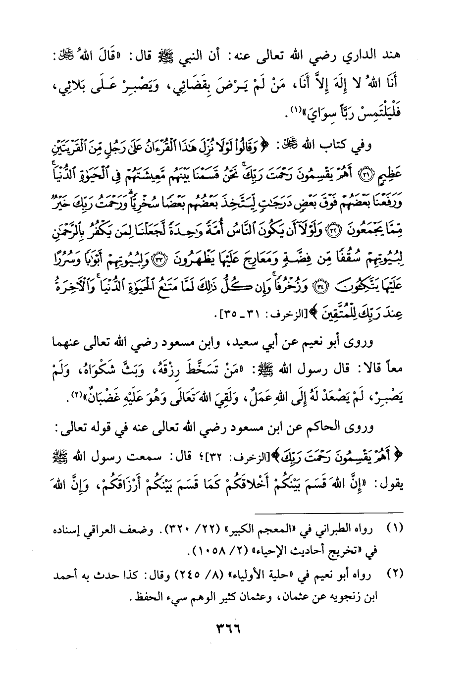وفي كتاب الله عز وجل: {وَقَالُوا لَوْلَا نُزِّلَ هَذَا الْقُرْآنُ عَلَى رَجُلٍ مِنَ الْقَرْيَتَيْنِ عَظِيمٍ (31) أَهُمْ يَقْسِمُونَ رَحْمَتَ رَبِّكَ نَحْنُ قَسَمْنَا بَيْنَهُمْ مَعِيشَتَهُمْ فِي الْحَيَاةِ الدُّنْيَا وَرَفَعْنَا بَعْضَهُمْ فَوْقَ بَعْضٍ دَرَجَاتٍ لِيَتَّخِذَ بَعْضُهُمْ بَعْضًا سُخْرِيًّا وَرَحْمَتُ رَبِّكَ خَيْرٌ مِمَّا يَجْمَعُونَ (32) وَلَوْلَا أَنْ يَكُونَ النَّاسُ أُمَّةً وَاحِدَةً لَجَعَلْنَا لِمَنْ يَكْفُرُ بِالرَّحْمَنِ لِبُيُوتِهِمْ سُقُفًا مِنْ فِضَّةٍ وَمَعَارِجَ عَلَيْهَا يَظْهَرُونَ (33) وَلِبُيُوتِهِمْ أَبْوَابًا وَسُرُرًا عَلَيْهَا يَتَّكِئُونَ (34) وَزُخْرُفًا وَإِنْ كُلُّ ذَلِكَ لَمَّا مَتَاعُ الْحَيَاةِ الدُّنْيَا وَالْآخِرَةُ عِنْدَ رَبِّكَ لِلْمُتَّقِينَ} [الزخرف: 31 - 35].