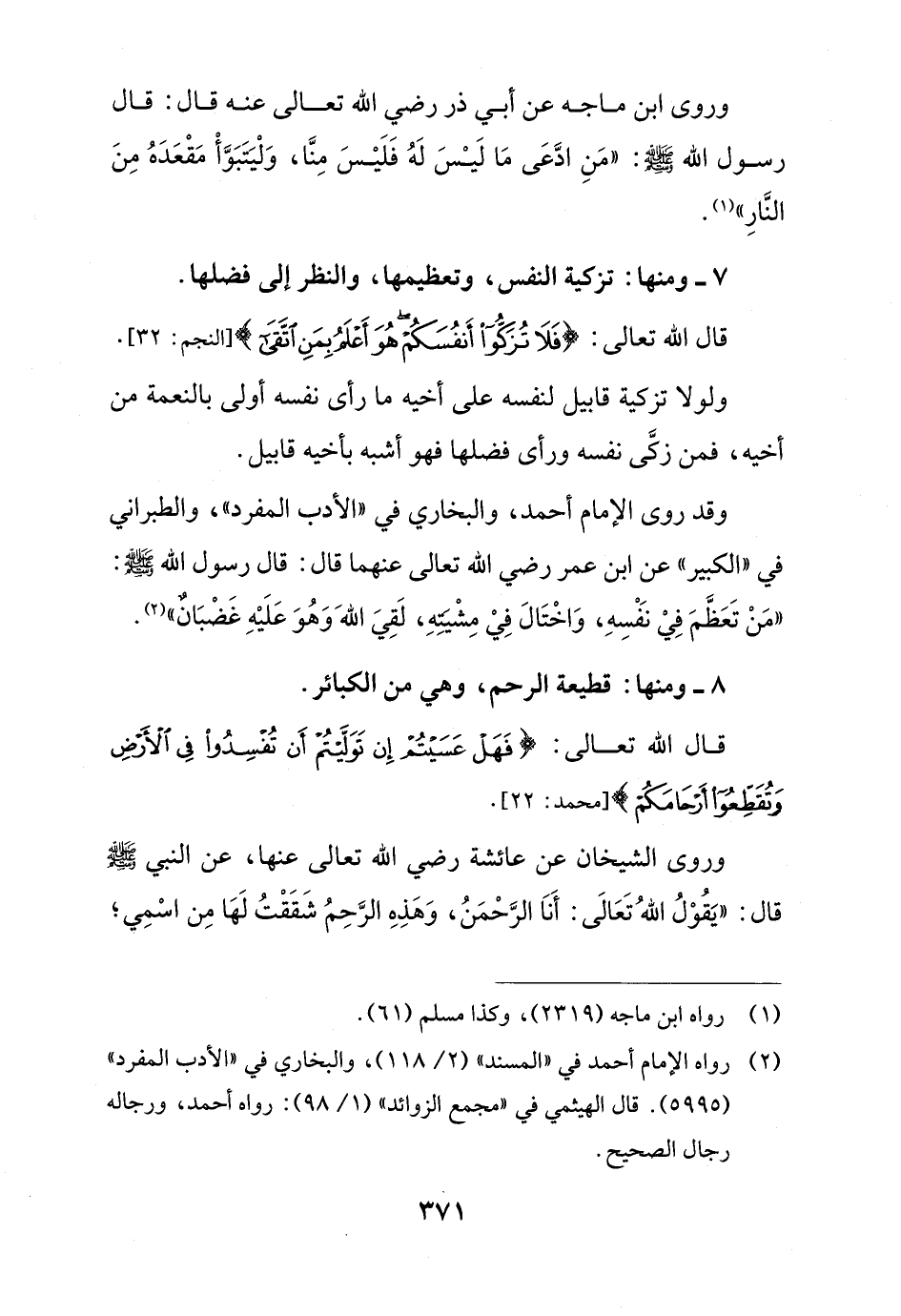 7 - ومنها: تزكية النفس، وتعظيمها، والنظر إلى فضلها.