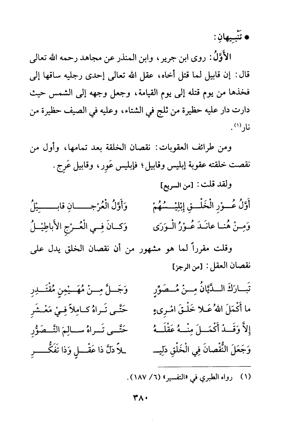 الأَوَّلُ: روى ابن جرير، وابن المنذر عن مجاهد رحمه الله تعالى قال: إن قابيل لما قتل أخاه، عقل الله تعالى إحدى رجليه ساقها إلى فخذها من يوم قتله إلى يوم القيامة، وجعل وجهه إلى الشمس حيث دارت دار عليه حظيرة من ثلج في الشتاء، وعليه في الصيف حظيرة من نار (¬1).