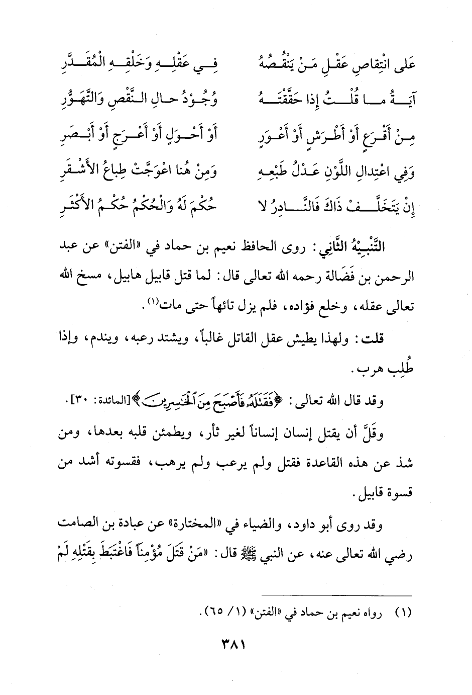التَّنْبِيْهُ الثَّانِي: روى الحافظ نعيم بن حماد في "الفتن" عن عبد الرحمن بن فَضَالة رحمه الله تعالى قال: لما قتل قابيل هابيل، مسخ الله تعالى عقله، وخلع فؤاده، فلم يزل تائهاً حتى مات (¬1).