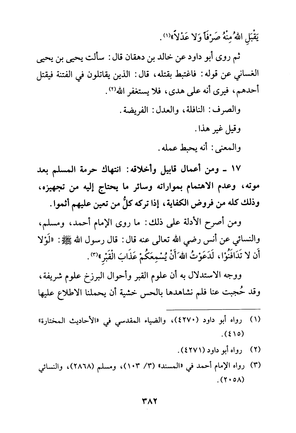 ووجه الاستدلال به أن علوم القبر وأحوال البرزخ علوم شريفة، وقد حُجبت عنا فلم نشاهدها بالحس خشية أن يحملنا الاطلاع عليها