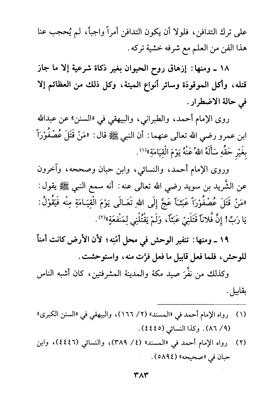 وروى الإمام أحمد، والنسائي، وابن حبان وصححه، وآخرون عن الشَّريد بن سويد رضي الله تعالى عنه: أنه سمع النبي - صلى الله عليه وسلم - يقول: "مَنْ قَتَلَ عُصْفُوْرًا عَبَثًا عَجَّ إِلَى اللهِ تَعَالَى يَوْمَ الْقِيَامَةِ مِنْه فَيَقُوْلُ: يَا رَبِّ! إِنَّ فُلاناً قتلَنِيْ عَبَثًا، وَلَمْ يَقْتُلْنِي لِمَنْفعَةٍ" (¬2).