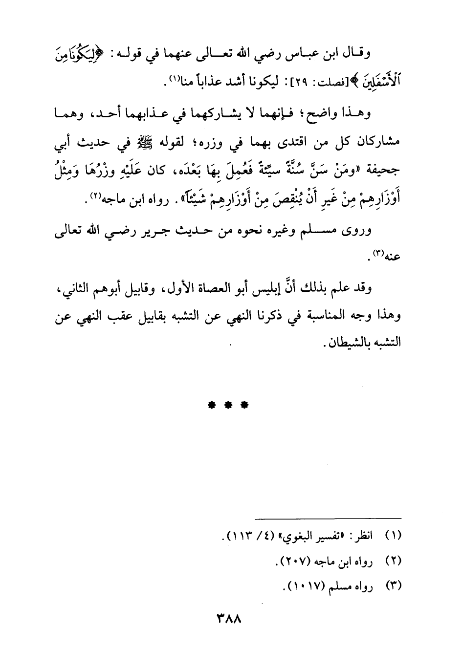 وقد علم بذلك أنَّ إبليس أبو العصاة الأول، وقابيل أبوهم الثاني، وهذا وجه المناسبة في ذكرنا النهي عن التشبه بقابيل عقب النهي عن التشبه بالشيطان.