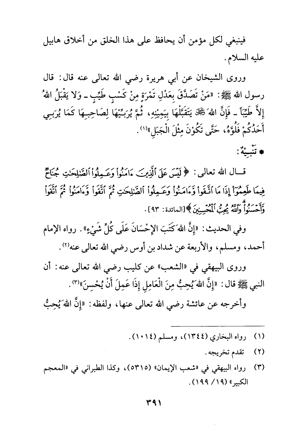 وفي الحديث: "إِنَّ الله كتَبَ الإِحْسَانَ عَلَى كُلِّ شَيْءٍ". رواه الإِمام أحمد، ومسلم، والأربعة عن شداد بن أوس رضي الله تعالى عنه (¬2).