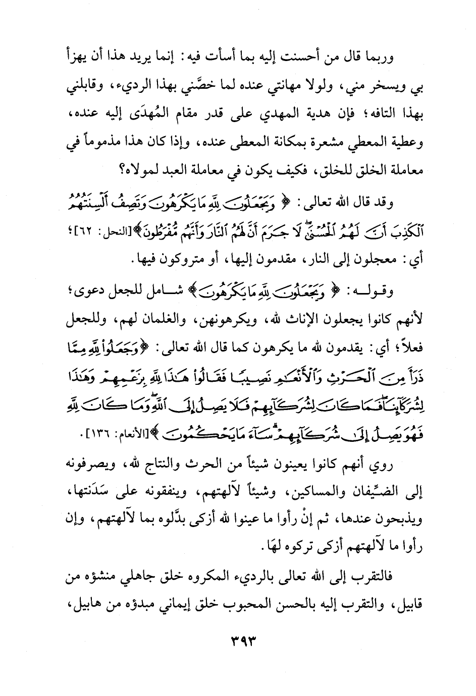 وقوله: {وَيَجْعَلُونَ لِلَّهِ مَا يَكْرَهُونَ} شامل للجعل دعوى؛ لأنهم كانوا يجعلون الإناث لله، ويكرهونهن، والغلمان لهم، وللجعل فعلًا؛ أي: يقدمون لله ما يكرهون كما قال الله تعالى: {وَجَعَلُوا لِلَّهِ مِمَّا ذَرَأَ مِنَ الْحَرْثِ وَالْأَنْعَامِ نَصِيبًا فَقَالُوا هَذَا لِلَّهِ بِزَعْمِهِمْ وَهَذَا لِشُرَكَائِنَا فَمَا كَانَ لِشُرَكَائِهِمْ فَلَا يَصِلُ إِلَى اللَّهِ وَمَا كَانَ لِلَّهِ فَهُوَ يَصِلُ إِلَى شُرَكَائِهِمْ سَاءَ مَا يَحْكُمُونَ} [الأنعام: 136].