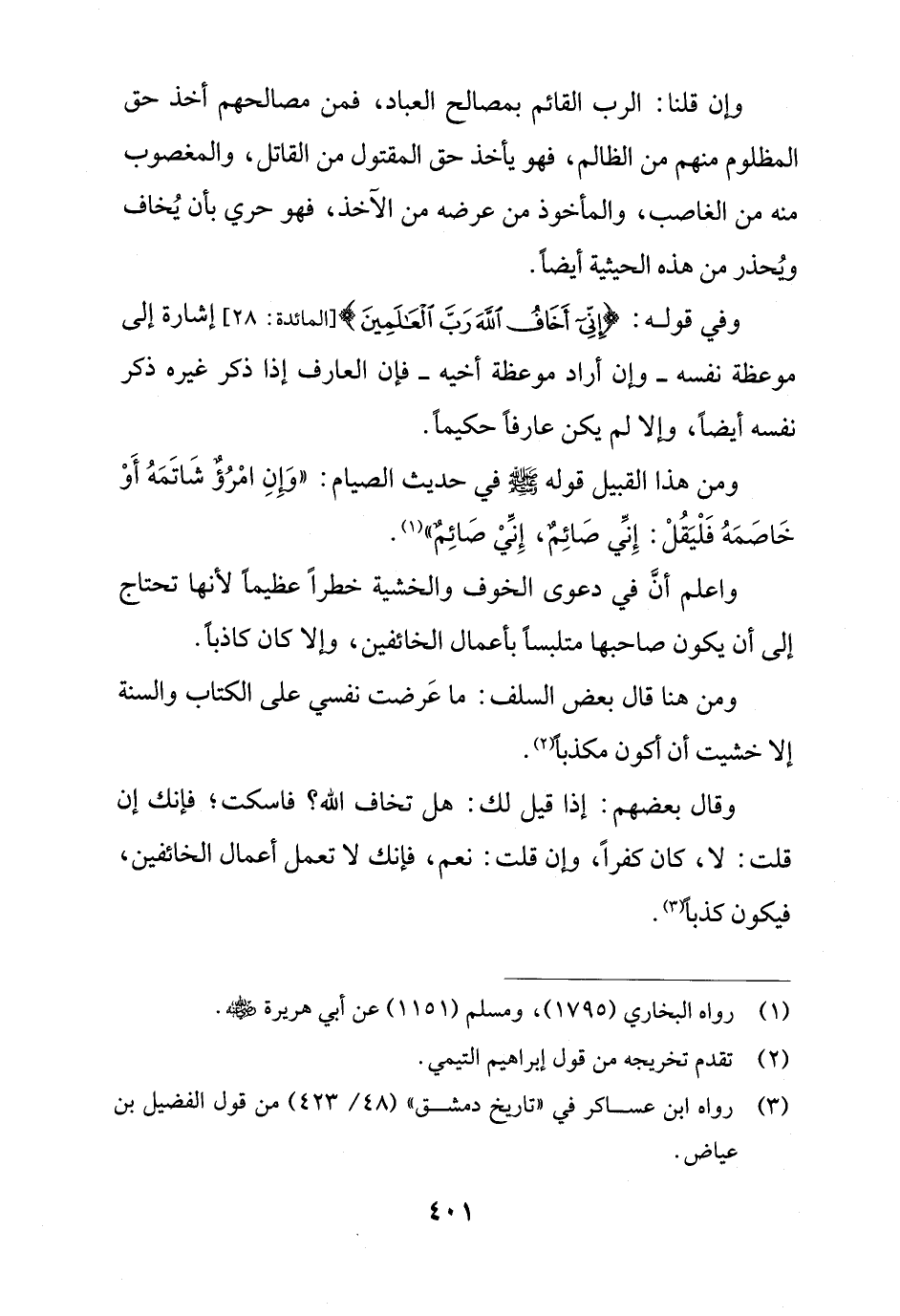 واعلم أنَّ في دعوى الخوف والخشية خطرًا عظيمًا لأنها تحتاج إلى أن يكون صاحبها متلبسًا بأعمال الخائفين، وإلا كان كاذبًا.