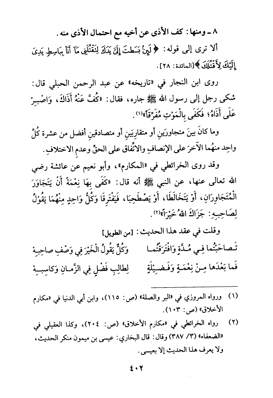 وقد روى الخرائطي في "المكارم"، وأبو نعيم عن عائشة رضي الله تعالى عنها، عن النبي - صلى الله عليه وسلم - أنه قال: "كَفَى بِهَا نِعْمَةً أَنْ يَتَجَاوَرَ الْمُتَجَاوِرَانِ، أَوْ يتَخَالَطَا، أَوْ يَصْطَحِبَا، فَيَفْتَرِقَا وَكُلُّ وَاحِدٍ مِنْهُمَا يَقُوْلُ لِصَاحِبِهِ: جَزَاكَ اللهُ خَيْرًا" (¬2).