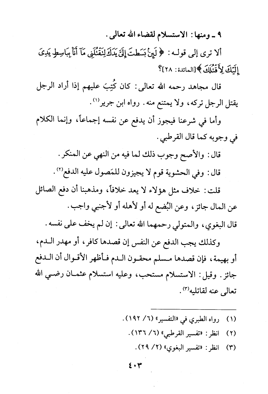 وكذلك يجب الدفع عن النفس إن قصدها كافر، أو مهدر الدم، أو بهيمة، فإن قصدها مسلم محقون الدم فأظهر الأقوال أن الدفع جائز. وقيل: الاستسلام مستحب، وعليه استسلام عثمان رضي الله تعالى عنه لقاتليه (¬3).
