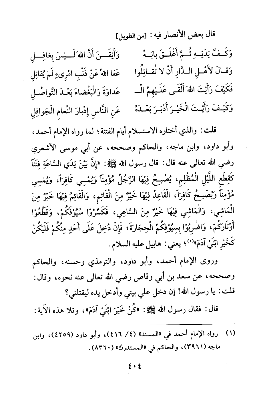 قلت: والذي أختاره الاستسلام أيام الفتنة؛ لما رواه الإِمام أحمد، وأبو داود، وابن ماجه، والحاكم وصححه، عن أبي موسى الأشعري رضي الله تعالى عنه قال: قال رسول الله - صلى الله عليه وسلم -: " إِنَّ بَيْنَ يَدَي السَّاعَةِ فِتَنًا كَقِطَعِ اللَّيْلِ الْمُظْلِمِ، يُصْبحُ فِيْهَا الرَّجُلُ مُؤْمِنًا ويُمْسِي كَافِرًا، ويُمْسِي مُؤْمِنًا ويُصْبحُ كَافِرًا، الْقَاعِدُ فِيْهَا خَيْرٌ مِنَ الْقَائِمِ، وَالْقَائِمُ فِيْهَا خَيْر مِنَ الْمَاشِي، وَالْمَاشِي فِيْهَا خَيْر مِنَ السَّاعِي، فَكَسِّرُوْا سُيُوْفَكُمْ، وَقَطِّعُوْا أَوْتَارَكُمْ، وَاضْرِبُوْا بِسِيُوْفكُمُ الْحِجَارَةَ؛ فَإِنْ دُخِلَ عَلَى أَحَدٍ مِنْكُمْ فَلْيَكُنْ كَخَيْرِ ابْنَيْ آدَمَ" (¬1)؟ يعني: هابيل عليه السلام.