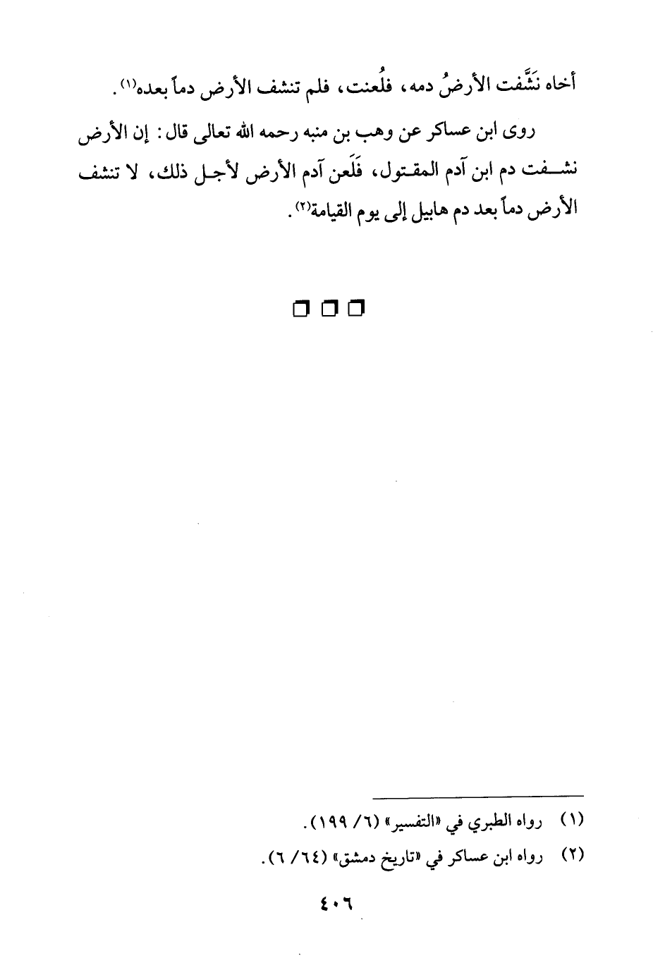روى ابن عساكر عن وهب بن منبه رحمه الله تعالى قال: إن الأرض نشفت دم ابن آدم المقتول، فَلَعن آدم الأرض لأجل ذلك، لا تنشف الأرض دماً بعد دم هابيل إلى يوم القيامة (¬2).