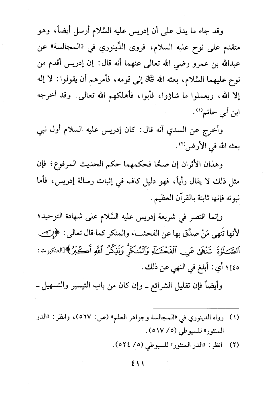 وهذان الأثران إن صحَّا فحكمهما حكم الحديث المرفوع؛ فإن مثل ذلك لا يقال رأياً، فهو دليل كاف في إثبات رسالة إدريس، فأما نبوته فإنها ثابتة بالقرآن العظيم.