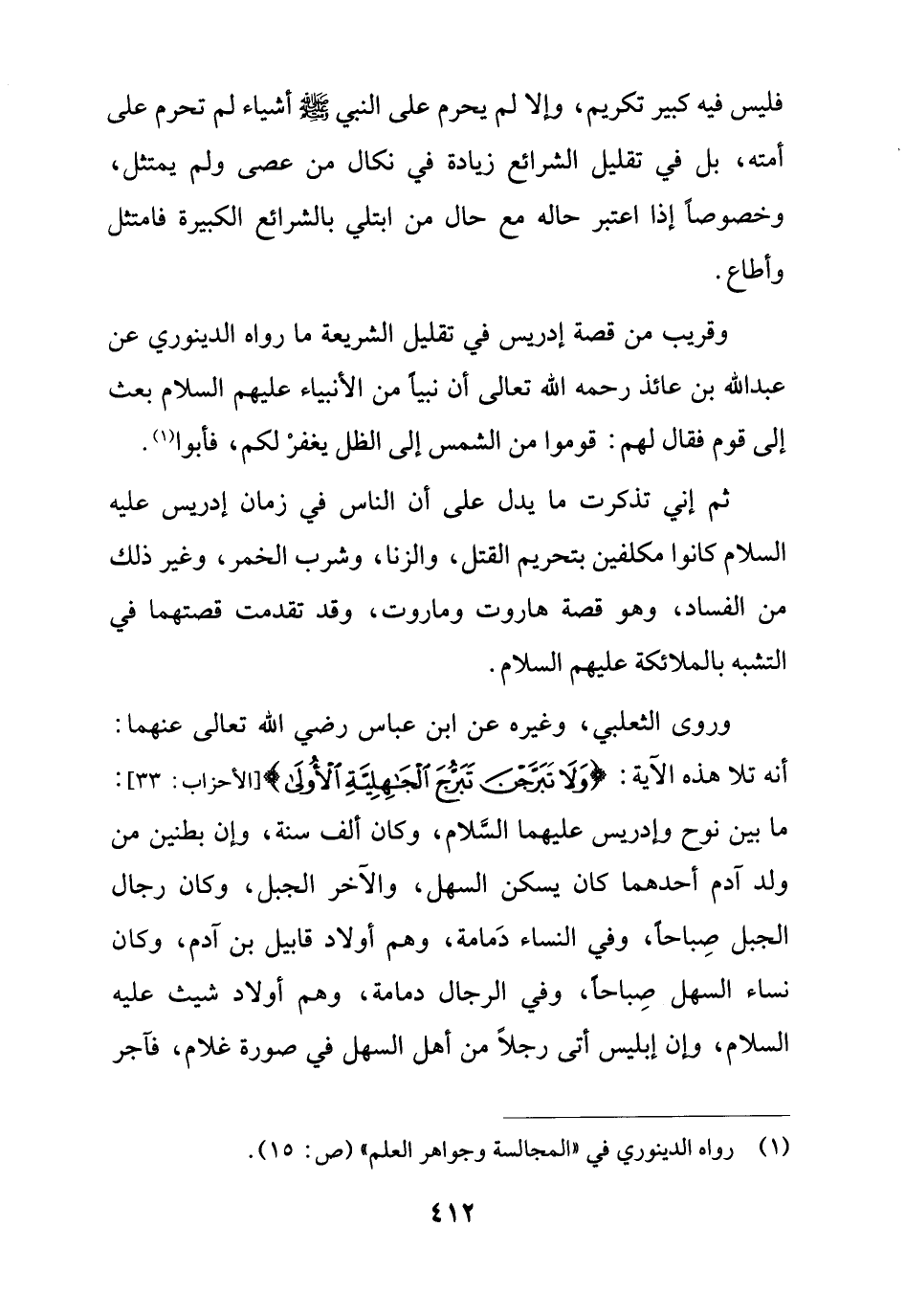 ثم إني تذكرت ما يدل على أن الناس في زمان إدريس عليه السلام كانوا مكلفين بتحريم القتل، والزنا، وشرب الخمر، وغير ذلك من الفساد، وهو قصة هاروت وماروت، وقد تقدمت قصتهما في التشبه بالملائكة عليهم السلام.