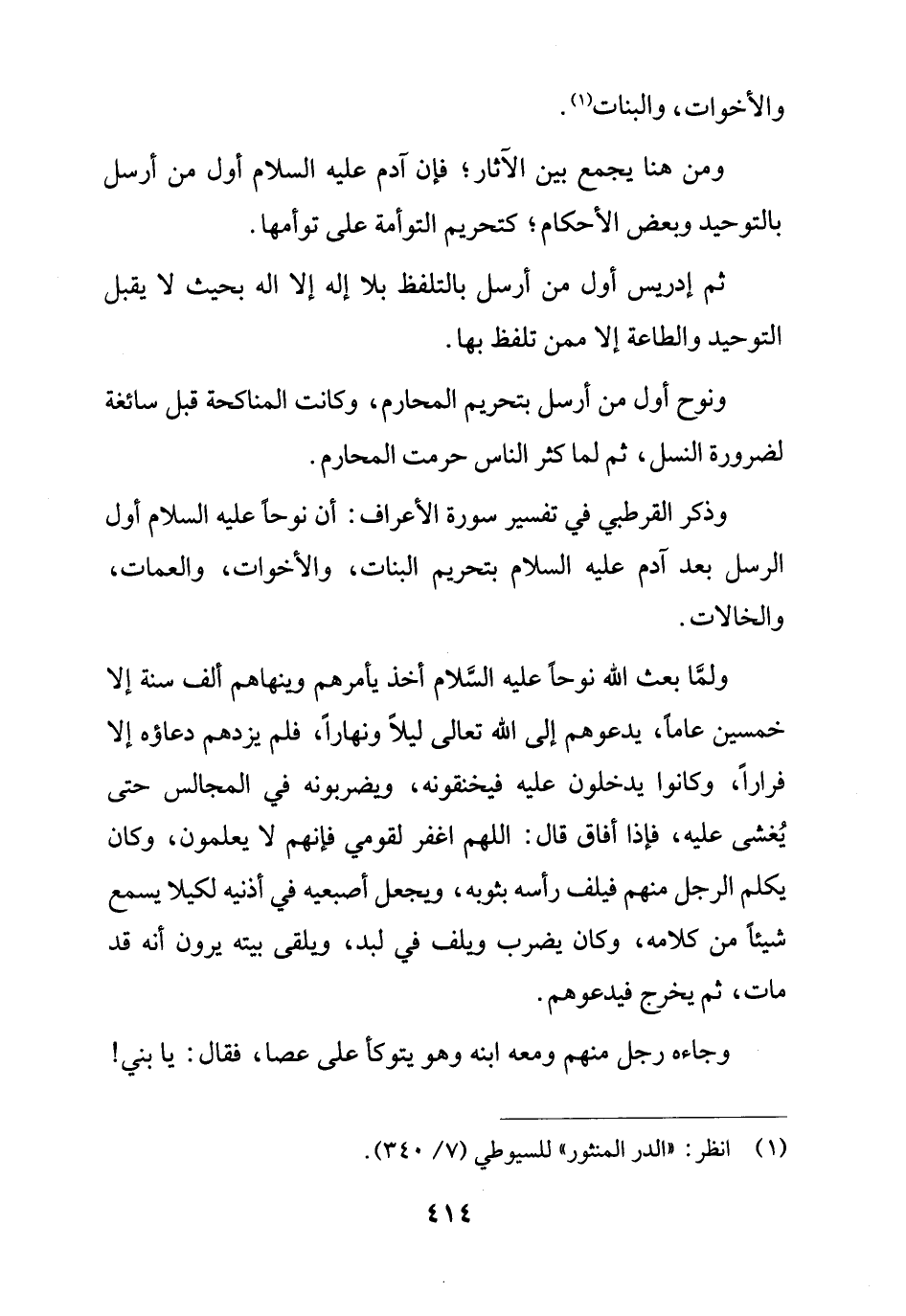 وذكر القرطبي في تفسير سورة الأعراف: أن نوحا عليه السلام أول الرسل بعد آدم عليه السلام بتحريم البنات، والأخوات، والعمات، والخالات.