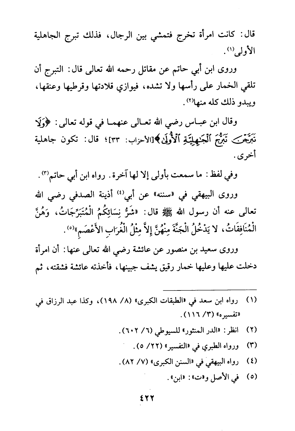 وروى ابن أبي حاتم عن مقاتل رحمه الله تعالى قال: التبرج أن تلقي الخمار على رأسها ولا تشده، فيوازي قلادتها وقرطيها وعنقها، ويبدو ذلك كله منها (¬2).