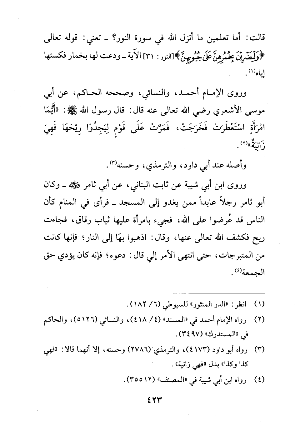 وروى الإِمام أحمد، والنسائي، وصححه الحاكم، عن أبي موسى الأشعري رضي الله تعالى عنه قال: قال رسول الله - صلى الله عليه وسلم -: "أَيُّمَا امْرَأَةٍ اسْتَعْطَرَتْ فَخَرَجَتْ، فَمَرَّتْ عَلَى قَوْمٍ لِيَجِدُوْا رِيْحَهَا فَهِيَ زَانِيَةٌ" (¬2).