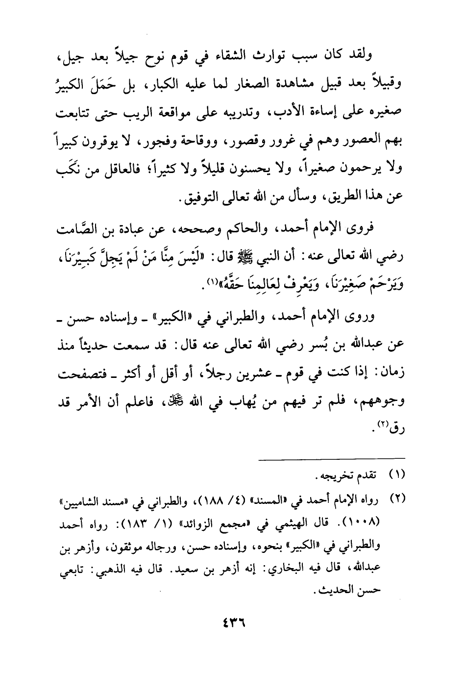 فروى الإِمام أحمد، والحاكم وصححه، عن عبادة بن الصَّامت رضي الله تعالى عنه: أن النبي - صلى الله عليه وسلم - قال: "لَيْسَ مِنَّا مَنْ لَمْ يَجِلَّ كَبِيْرَنَا، وَيرْحَمْ صَغِيْرَنَا، وَيعْرِفْ لِعَالِمِنَا حَقَّهُ" (¬1).