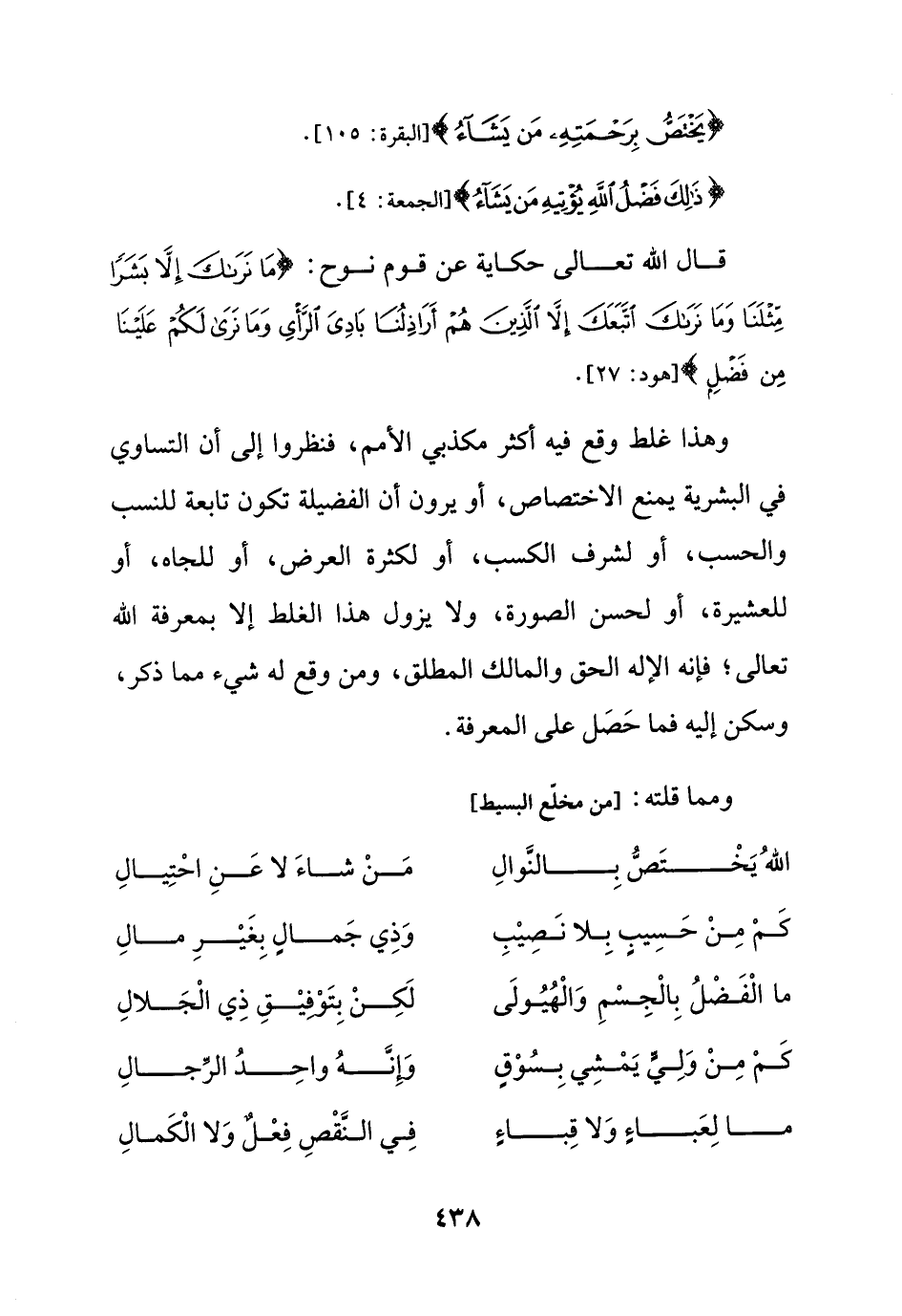 وهذا غلط وقع فيه أكثر مكذبي الأمم، فنظروا إلى أن التساوي في البشرية يمنع الاختصاص، أو يرون أن الفضيلة تكون تابعة للنسب والحسب، أو لشرف الكسب، أو لكثرة العرض، أو للجاه، أو للعشيرة، أو لحسن الصورة، ولا يزول هذا الغلط إلا بمعرفة الله تعالى؛ فإنه الإله الحق والمالك المطلق، ومن وقع له شيء مما ذكر، وسكن إليه فما حَصَل على المعرفة.