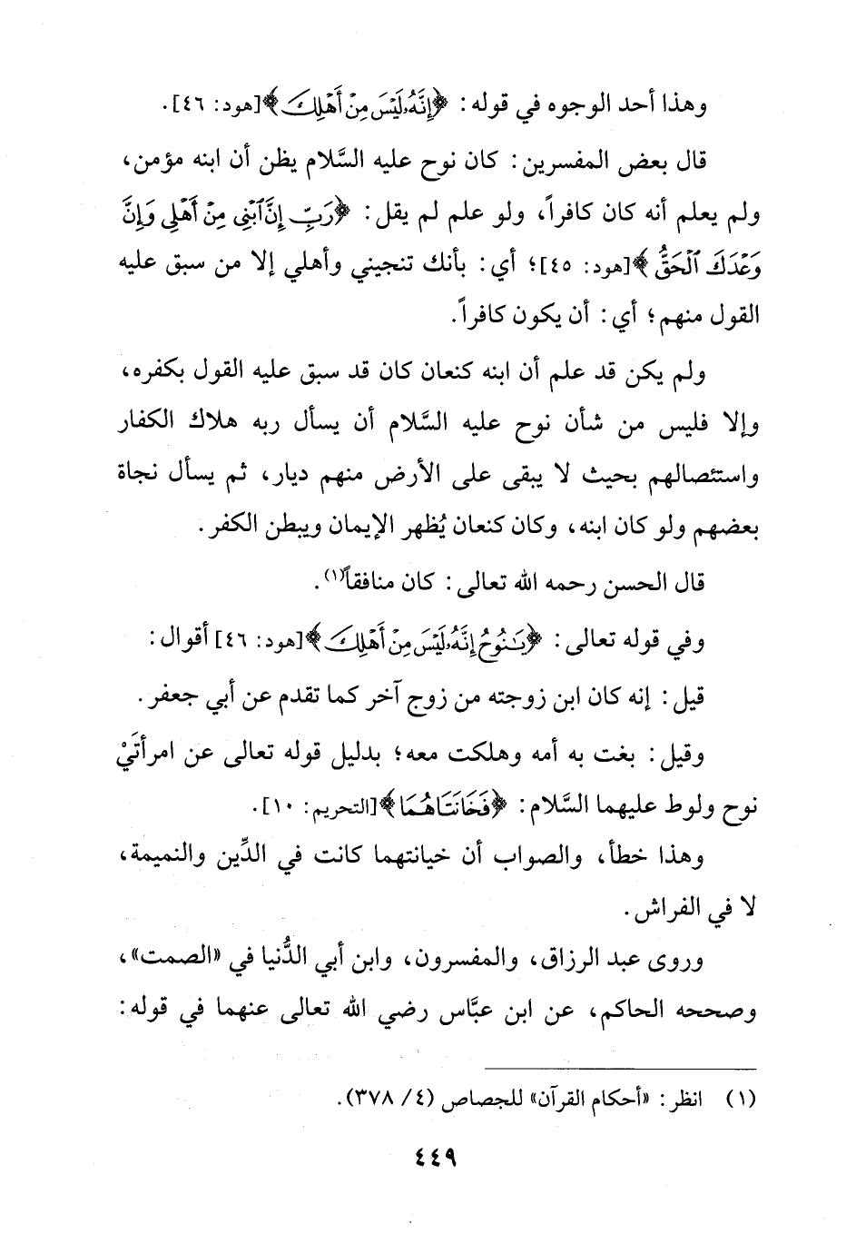وفي قوله تعالى: {يَا نُوحُ إِنَّهُ لَيْسَ مِنْ أَهْلِكَ} [هود: 46] أقوال: