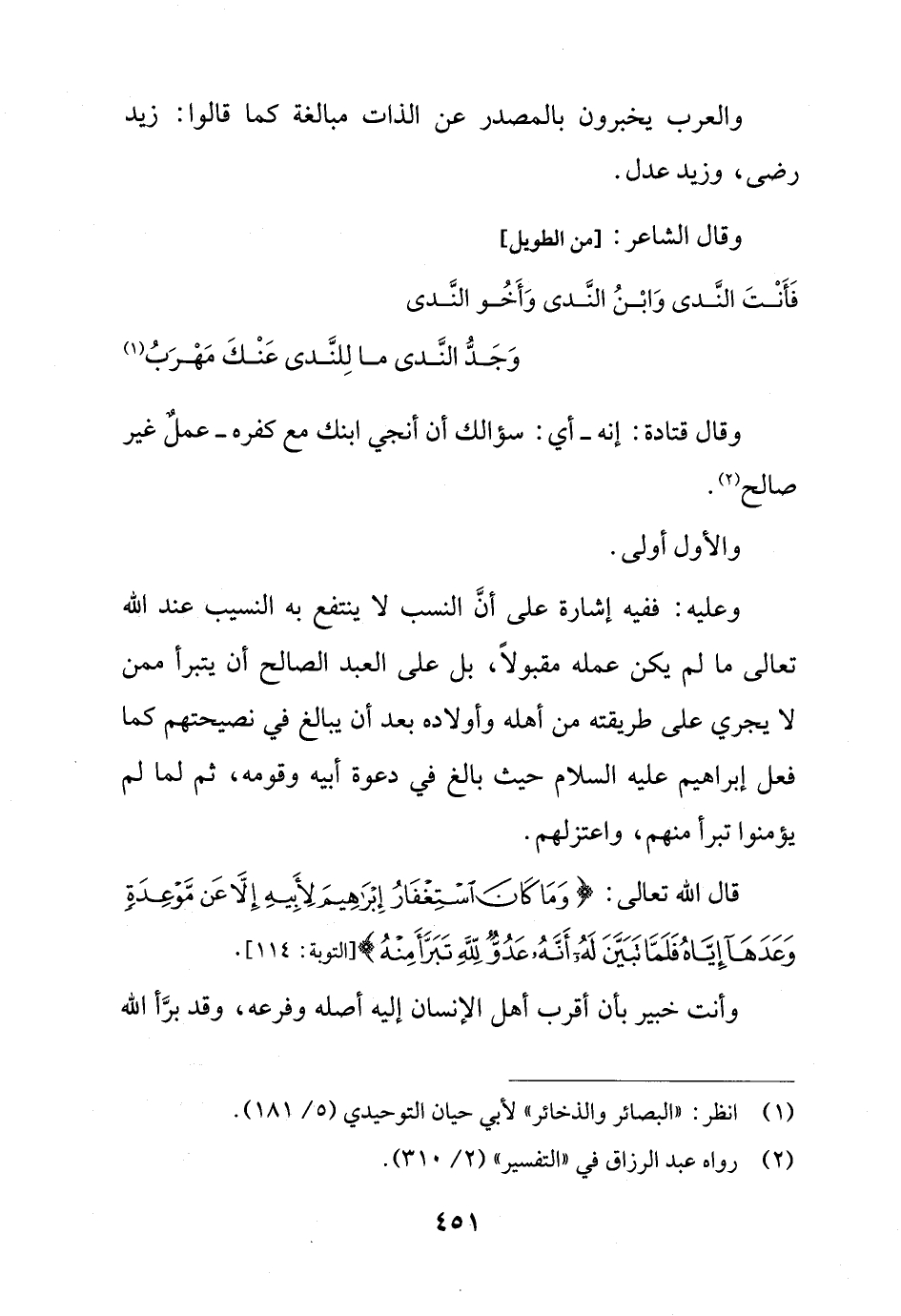 وعليه: ففيه إشارة على أنَّ النسب لا ينتفع به النسيب عند الله تعالى ما لم يكن عمله مقبولاً، بل على العبد الصالح أن يتبرأ ممن لا يجري على طريقته من أهله وأولاده بعد أن يبالغ في نصيحتهم كما فعل إبراهيم عليه السلام حيث بالغ في دعوة أبيه وقومه، ثم لما لم يؤمنوا تبرأ منهم، واعتزلهم.