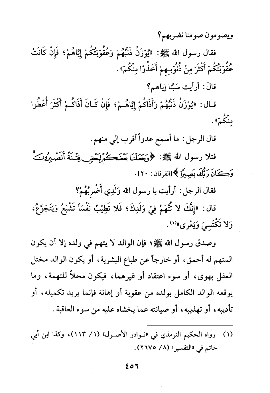 وصدق رسول الله - صلى الله عليه وسلم -؛ فإن الوالد لا يتهم في ولده إلا أن يكون المتهم له أحمق، أو خارجا عن طباع البشرية، أو يكون الوالد مختل العقل بهوى، أو سوء اعتقاد أو غيرهما، فيكون محلاً للتهمة، وما يوقعه الوالد الكامل بولده من عقوبة أو إهانة فإنما يريد تكميله، أو تأديبه، أو تهذيبه، أو صيانته عما يخشاه عليه من سوء العاقبة.