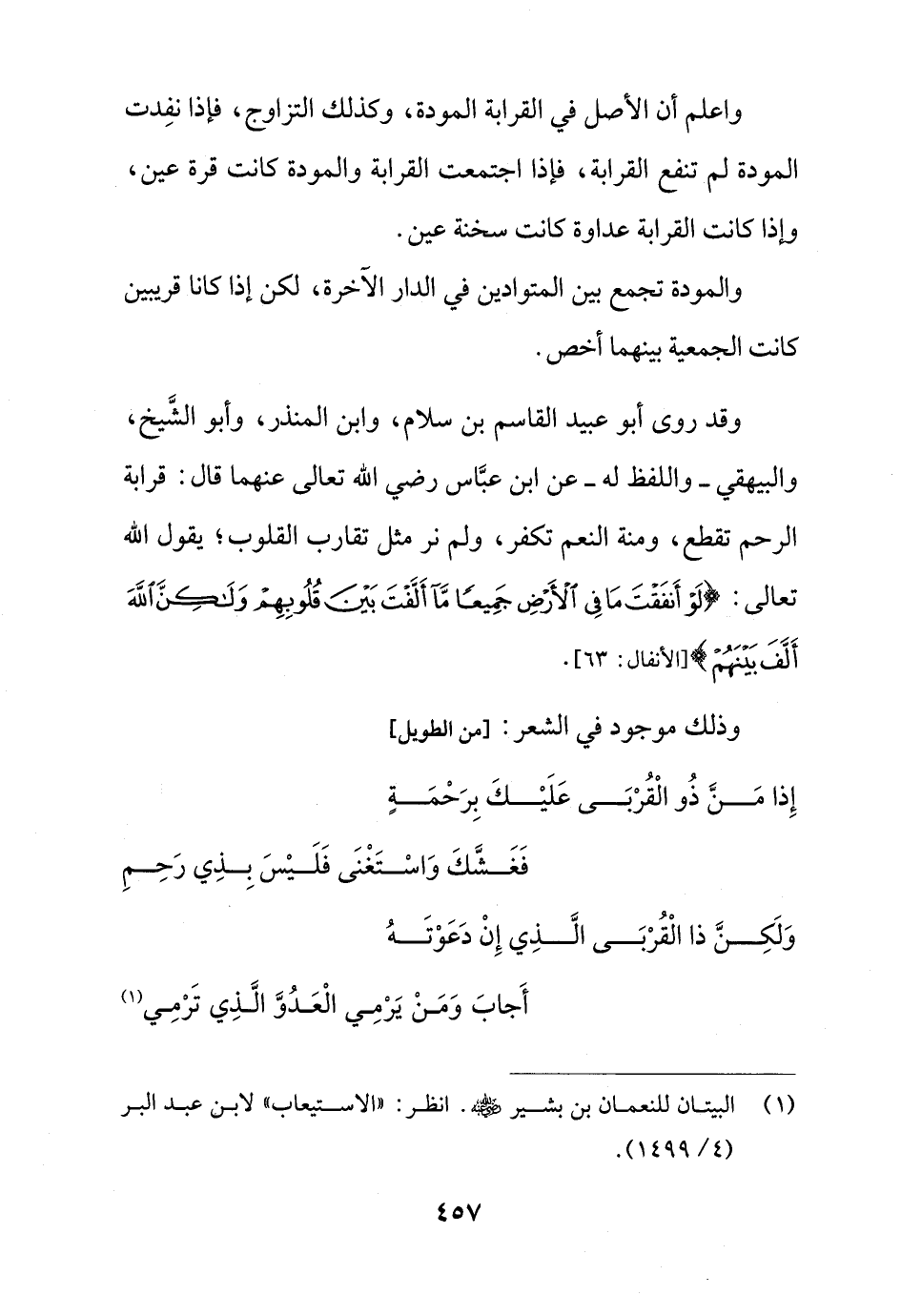 وقد روى أبو عبيد القاسم بن سلام، وابن المنذر، وأبو الشَّيخ، والبيهقي -واللفظ له- عن ابن عبَّاس رضي الله تعالى عنهما قال: قرابة الرحم تقطع، ومنة النعم تكفر، ولم نر مثل تقارب القلوب؛ يقول الله تعالى: {لَوْ أَنْفَقْتَ مَا فِي الْأَرْضِ جَمِيعًا مَا أَلَّفْتَ بَيْنَ قُلُوبِهِمْ وَلَكِنَّ اللَّهَ أَلَّفَ بَيْنَهُمْ} [الأنفال: 63].